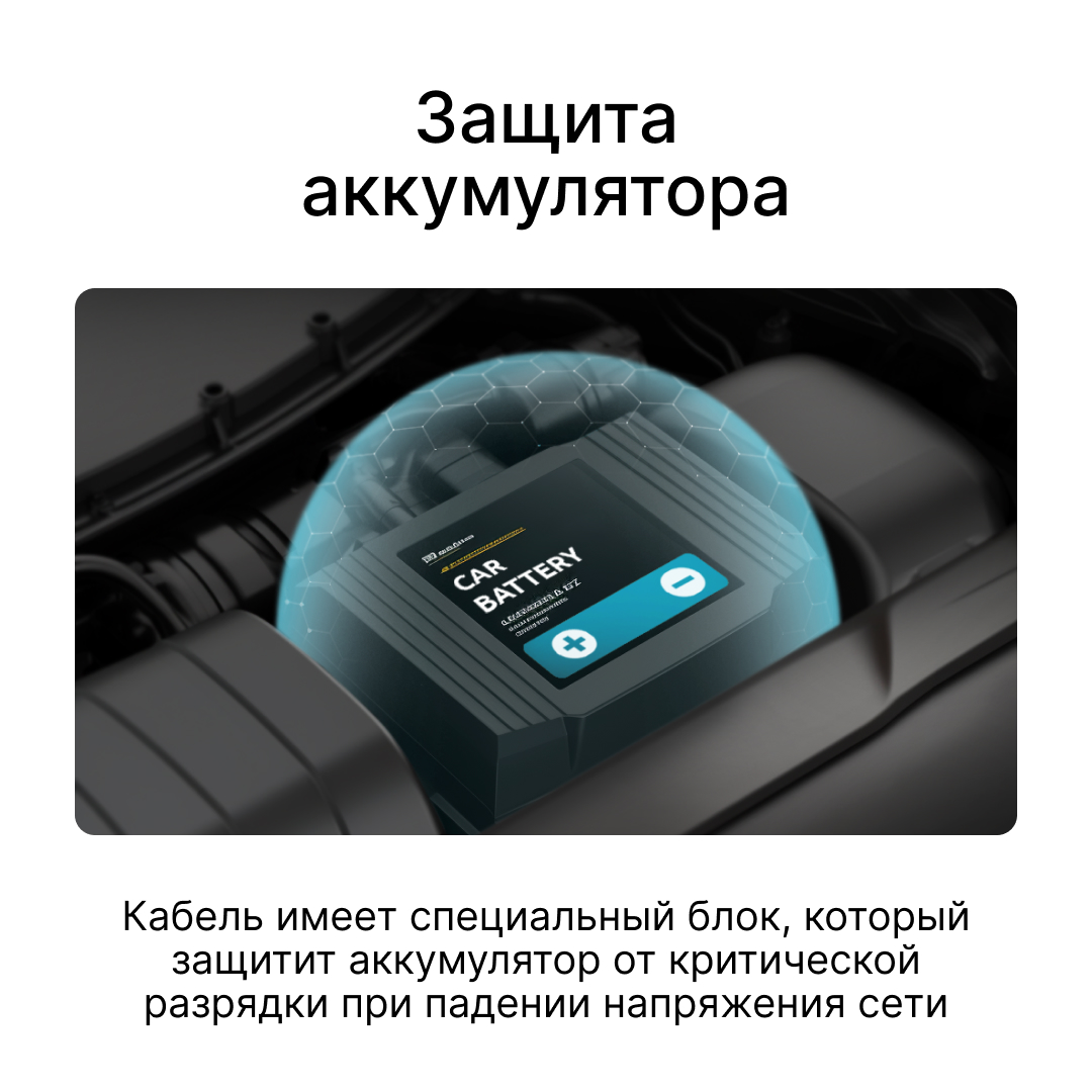 На некоторых кабелях питания есть блок защиты, который предотвращает критический разряд аккумулятора автомобиля. Для этого, при достижении нижнего предела напряжения сети блок защиты прекращает подачу напряжения питания на устройство.12,2 В (±0,1 В) для 12 В источника питания