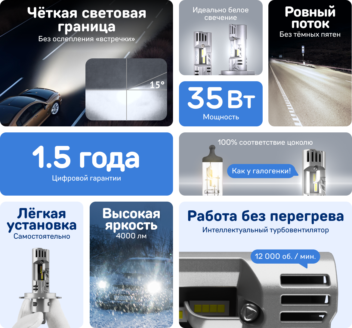 От бренда ibox имеется комбик в машине уже как год - прибор что надо. Когда сгорела лампа в правой фаре вспомнил что у ibox есть светодиодные..... Заказал прямиком с сайта - доставили в фирменной и надёжной упаковк.... По мощности и качеству свечения замечательные.