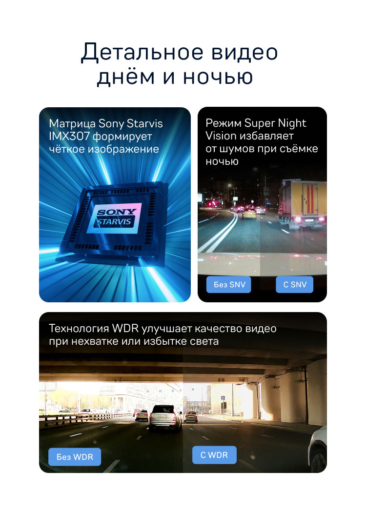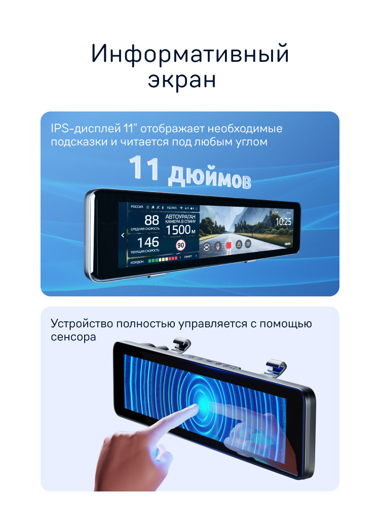 Экран в 11 дюймов. Встроенная патч-антенна для дальнобойного детектинга. Вовремя реагирует, видит камеры, направленные в спину, не ловит липовые сигналы. Ночной режим съёмки, режим сглаживания световых перепадов.