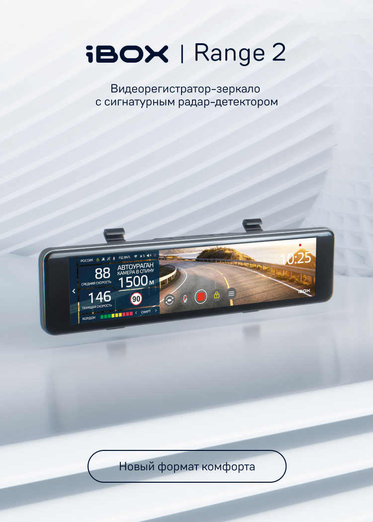 iBOX Range 2 — гибрид-зеркало с широкоформатным экраном высокого разрешения, полностью сенсорным управлением, высоким качеством съёмки и передовыми технологиями сигнатурного детектирования.