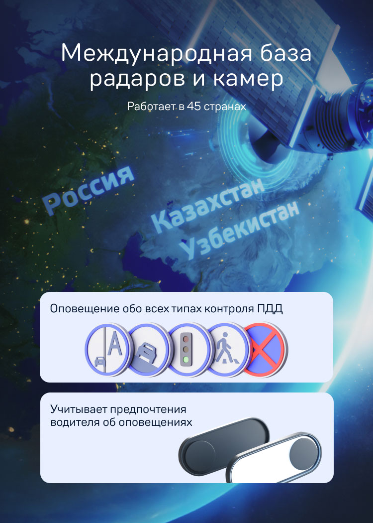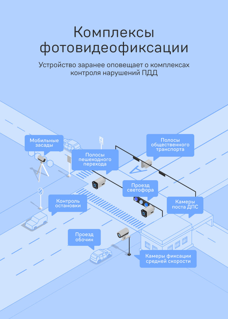 Устройство с помощью навигационных спутниковых систем определяет местоположение транспортного средства и сопоставляет его с ранее загруженной базой камер. Устройство предупреждает водителя о приближении к устройствам контроля скорости и камерам. Если загружена актуальная база камер, устройство будет точно информировать о каждом радаре и камере.