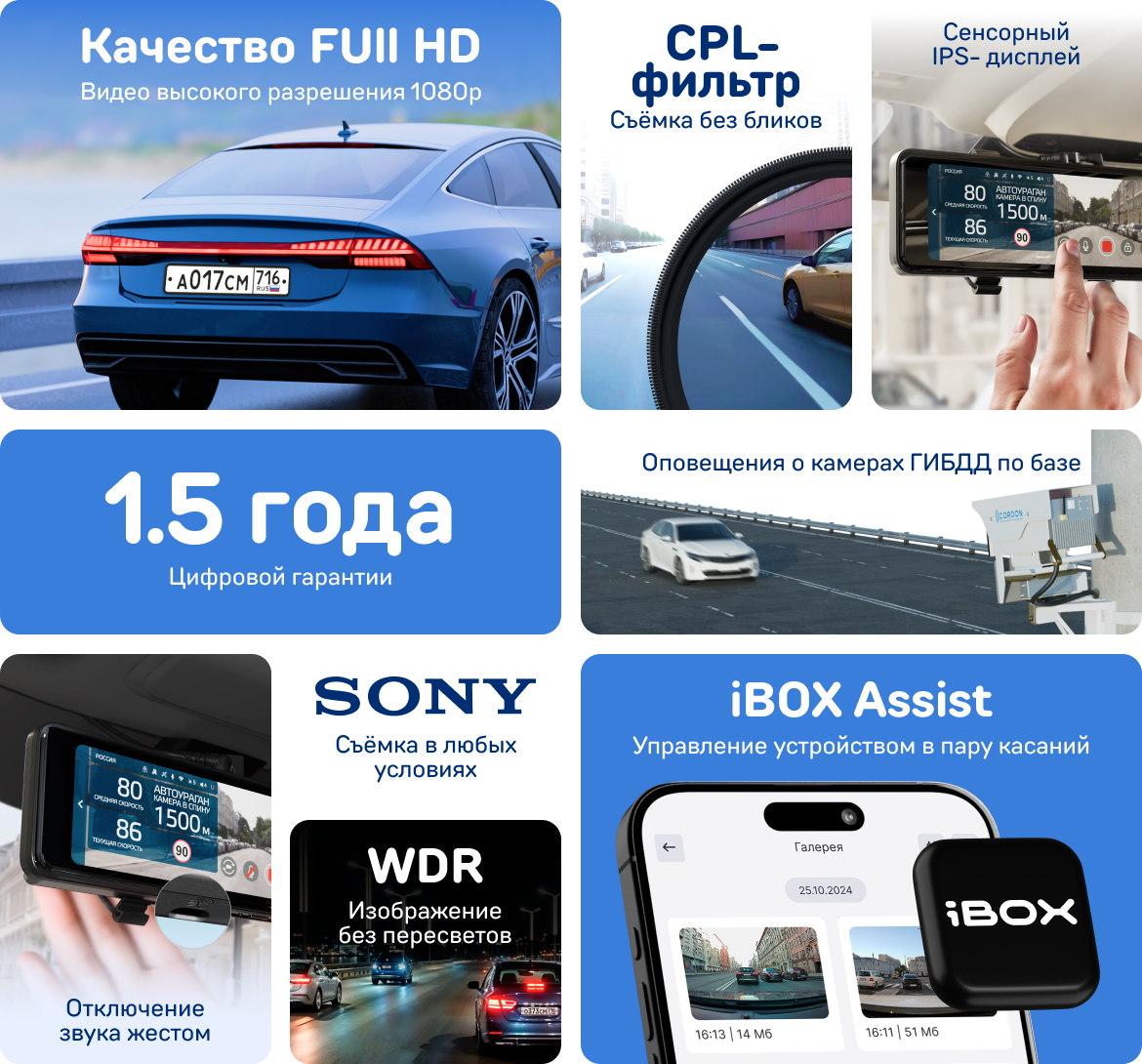 1. Матрица сони 2. Широкий дисплей 3. Приложение для скачивания видео и обнов (ibox assist) 4. G-сенсор с записью неудаляемого файла 5. Хорошая комплектация