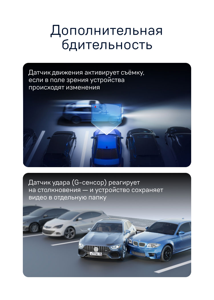 Функция «Режим парковки» позволяет устройству автоматически включать видеозапись в случае механического воздействия на кузов автомобиля, когда автомобиль заглушен (на парковке). При подключенной камере заднего вида, запись ведется с двух камер.